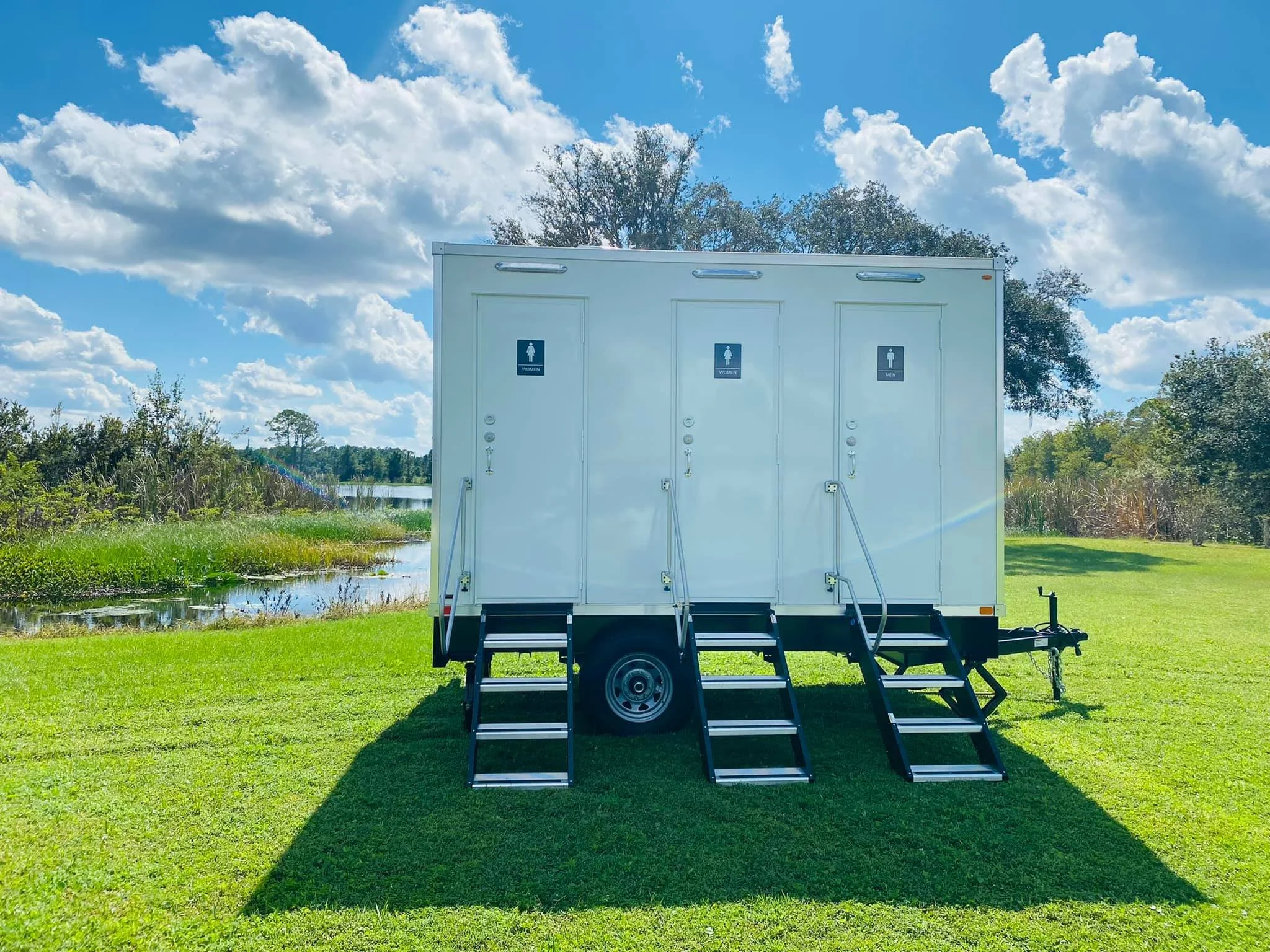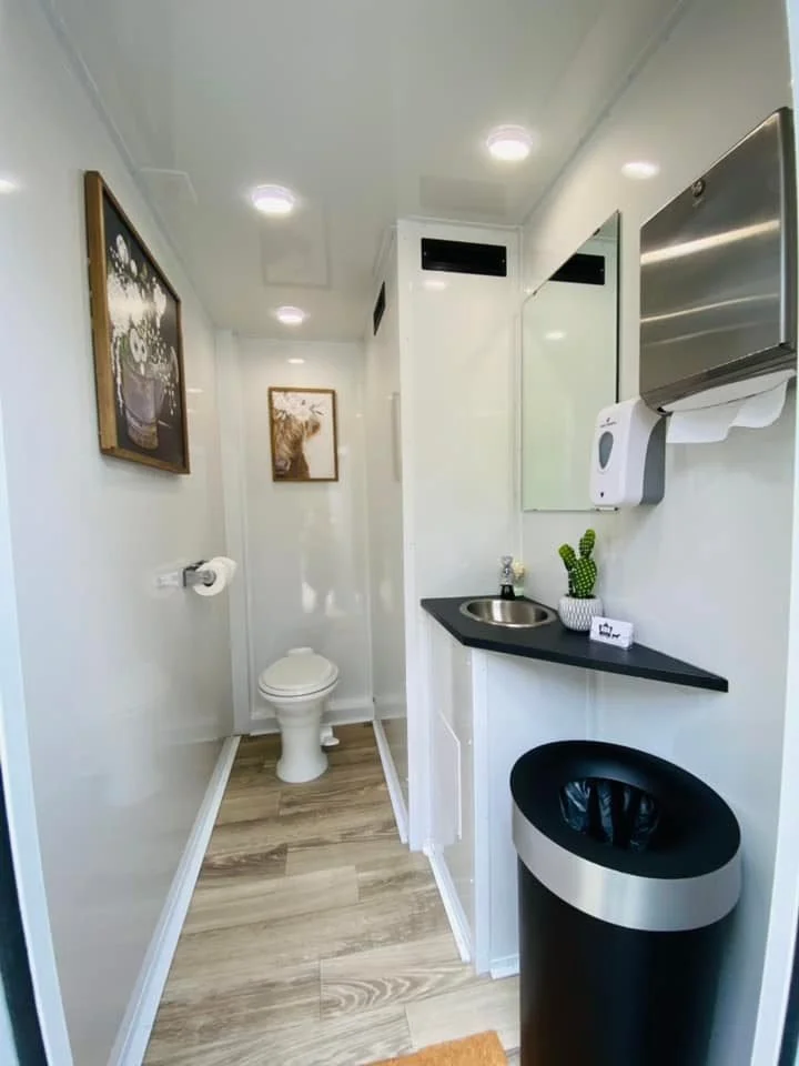 • Each side has full vanity with lighting, mirror, toiletries and flowing faucets.